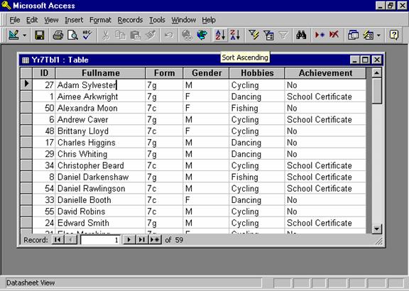 Year7TableOne). Double-clicking on this reveals a list of 59 records with each record (or row)